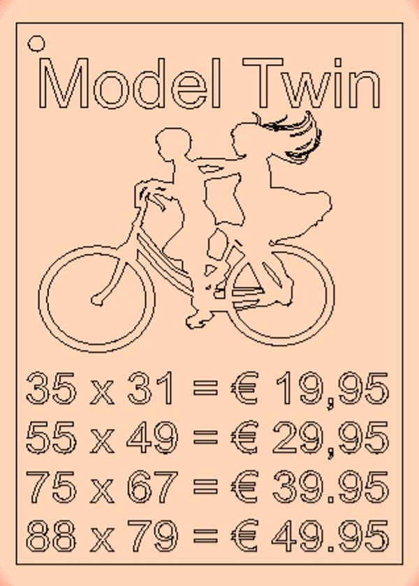 Twins op de fiets.Formaat in cm's 35x3155x4975x6788x79In verschillende kleuren te bestellen.Wilt u de afbeelding liever naar links fietsend hebben , geef dat dan aan bij uw bestelling.